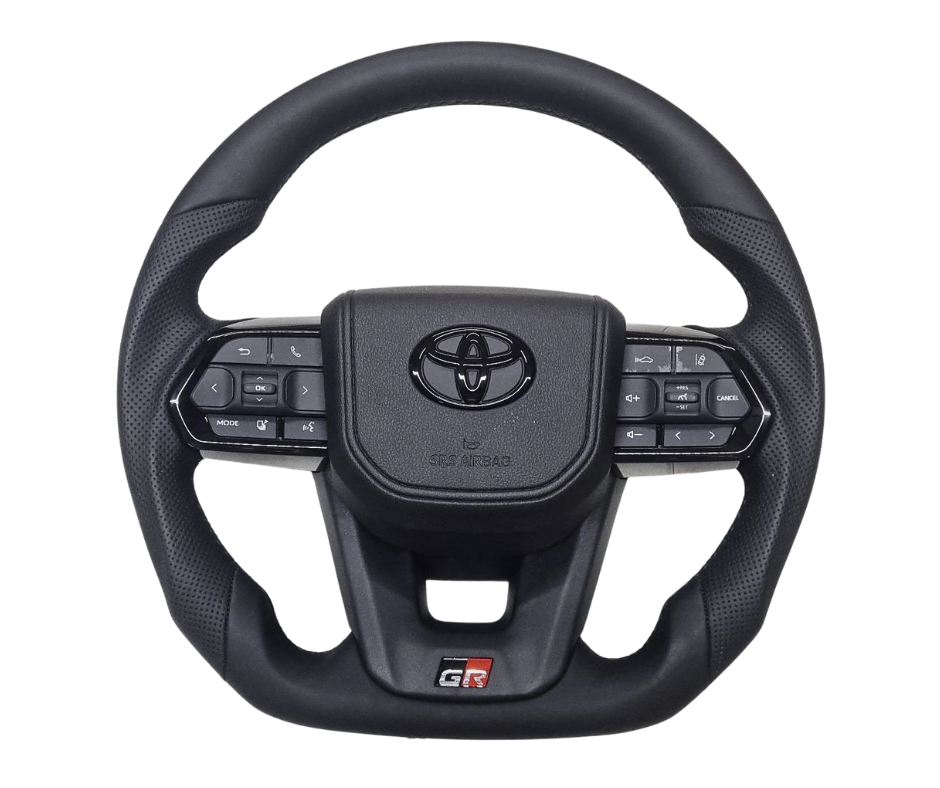 A modern SPORT steering wheel originally designed for the LC300 — now proven compatible with the Land Cruiser 70 Series, Toyota Hilux, and Toyota Fortuner.